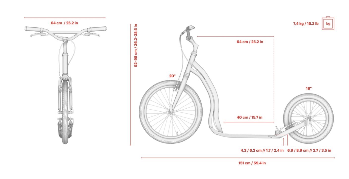 Rychlá koloběžka s hlinikovým rámem, koly 16' a 20', nosností až 150 kg a váhou 7,4 kg