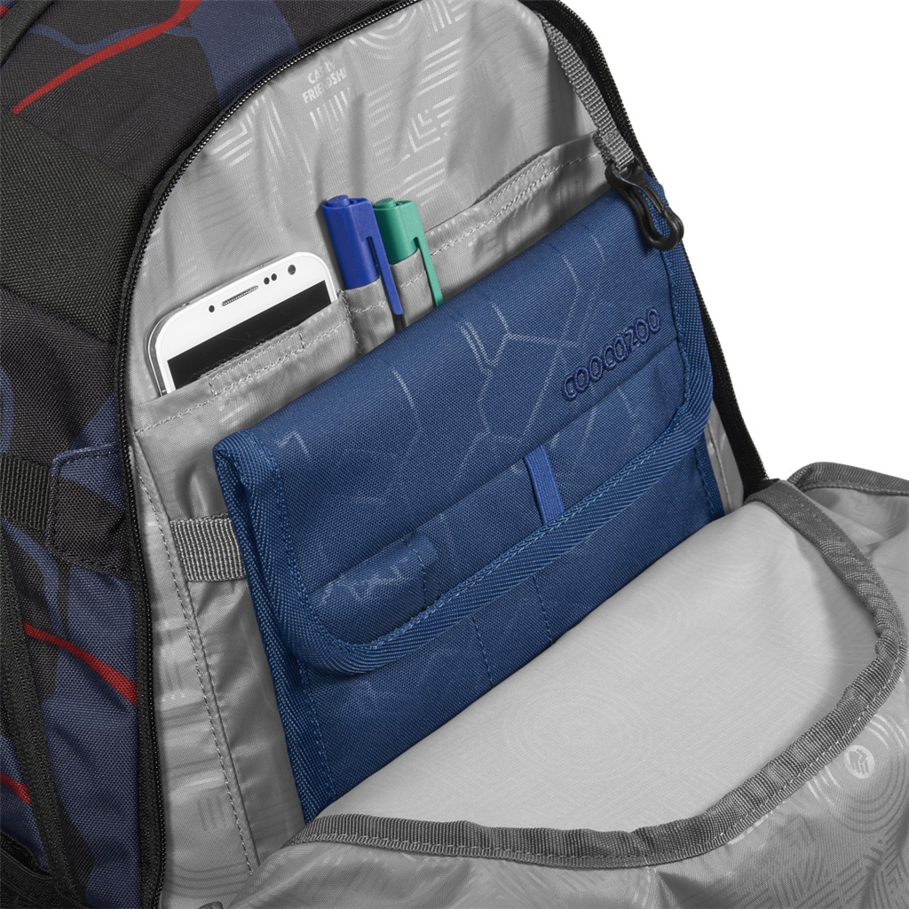 kapsa s organizérem na doklady, psací potřeby, karabinka na klíče a prostorná přední kapsa např. na svačinový box