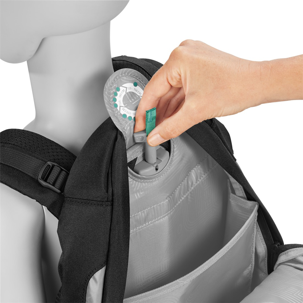 - možnost plynulého výškového nastavení ramenních popruhů pomocí otočného mechanismu uvnitř aktovky zajišťuje