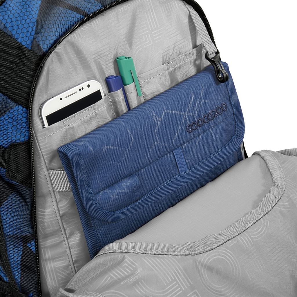 kapsa s organizérem na doklady, psací potřeby, karabinka na klíče a prostorná přední kapsa např. na svačinový box